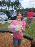 Easter brought on more fun. The kids trickled down the stairs as they woke up. The Easter Bunny had hid all of the eggs that the kids had colored. When everyone was up they got their baskets and found the eggs. E.B. didn't go overboard by any strech of the imagination this year. There was a pile on the table for them to all to divy up. There were bubbles, toothbrushes, a small chocolate bunny for each of them and a little more candy. Kendra got a book light rather than bubbles and she was a very happy camper.